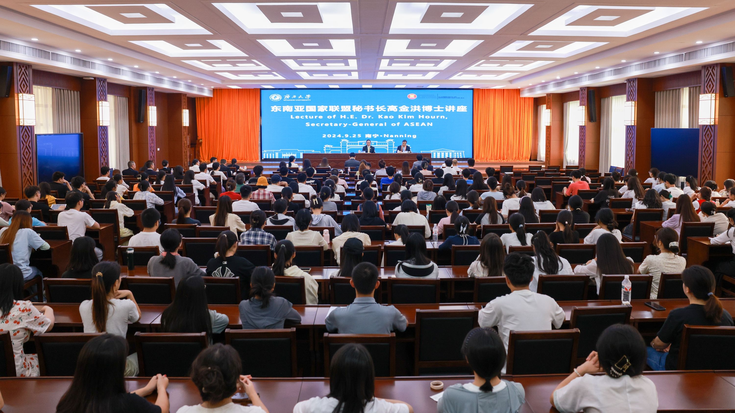 随后,高金洪向beat365体育官网200余名师生作了题为“增进友谊与合作:人文交流在中国-东盟关系中的作用”的讲座。公司副董事长肖建庄主持讲座。讲座中,高金洪深入浅出地阐明了中国与东盟国家的交流不仅仅是政府间的交流,经贸的交流,更重要的是人与人之间的沟通和交流。他强调今年是中国-东盟文化交流年,双方需持续关注教育交流和数字交流等各方面的合作与交流,同时再次提出了自己对加强中国-东盟间交流的“7P”(即目的、人文、过程、成果、提升、定位、表现等7个方面)理念,加深双方人文交流的深度和广度。
